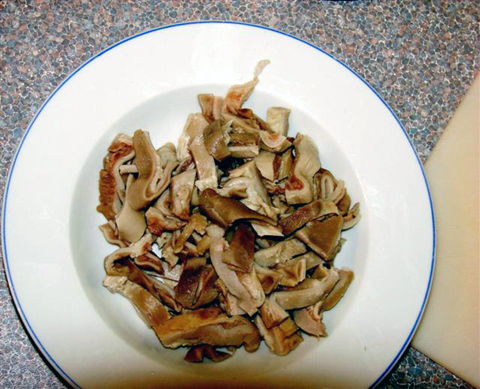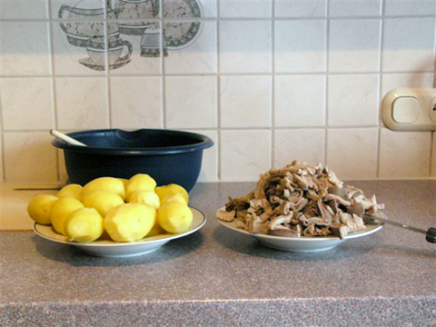 - Wasser in einen Topf geben, die Schweinemägen und Lorbeerblätter hinein geben und ca. 2,5 - 3 Stunden kochen. Danach aus dem Wasser nehmen und die weichgekochten Mägen in ca. 1,5 cm breite Streifen schneiden.