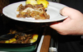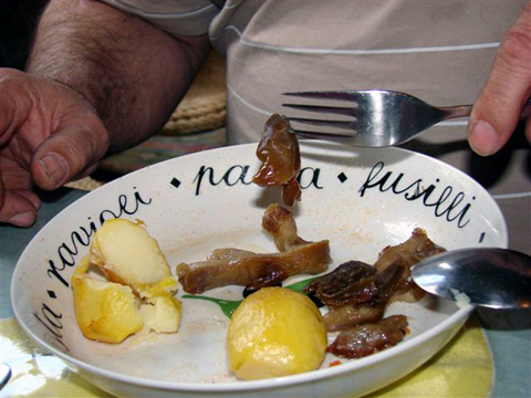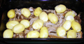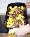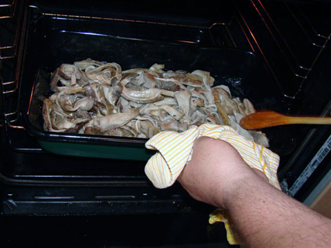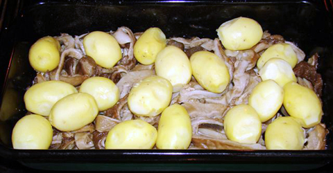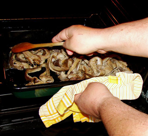 - Die geschnittenen Mägen mit Salz, Pfeffer und Knoblauch gut würzen. In ein Backblech Öl oder Schmalz geben, die gewürzten geschnittenen Mägen und Kartoffeln hinein geben und ca. 2 Stunden bei 180º braten.
